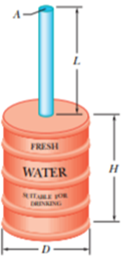 In Figure, an open tube of length L=1.8mand cross-sectional area A= 4.6cmis fixed to the top of a cylindrical barrel of diameterand height . The barrel and tube are filled with water (to the top of the tube).Calculate the ratio of the hydrostatic force on the bottom of the barrel to the gravitational force on the water contained in the barrel. Why is that ratio not equal to ? (You need not consider the atmospheric pressure.)