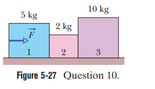 Figure 5-27 shows three blocks being pushed across a frictionless floor by horizontal force. What total mass is accelerated to the right by (a) force, (b) forceon block 2 from block 1, and (c) forceon block 3 from block 2? (d) Rank the blocks according to their acceleration magnitudes, greatest first. (e) Rank forces, and according to magnitude, greatest first.
