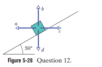 Figure 5-28 shows four choices for the direction of a force of magnitude F to be applied to a block on an inclined plane. The directions are either horizontal or vertical. (For choice b, the force is not enough to lift the block off the plane.) Rank the choices according to the magnitude of the normal force acting on the block from the