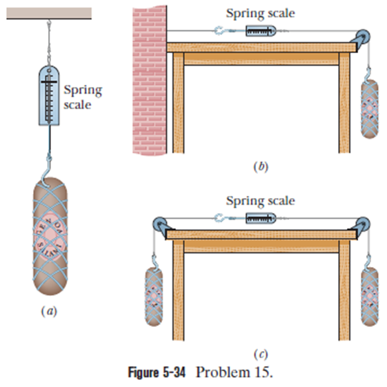 (a) An 11.0 kgSalami is supported by a cord that runs to a spring scale, which is supported by a cord hung from the ceiling (Figure-a). What is the reading on the scale, which is marked in weight units? (b) In Figure-bthe salami is supported by a cord that runs around a pulley and to a scale. The opposite end of the scale is attached by a cord to a wall. What is the reading on the scale? (c) In Figure-c the wall has been replaced with second11.0 kg salami, and the assembly is stationary. What is the reading on the scale?