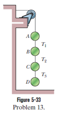 Figure 5.33 shows an arrangement in which four disks are suspended by cords. The longer, top cord loops over a frictionless pulley and pulls with a force of magnitude 98 N on the wall to which it is attached. The tensions in the three shorter cords areand . (a) What is the mass of disk A (b) What is the mass of disk B, (c) What is the mass of disk C, and (d) What is the mass of disk D?