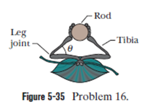 Some insects can walk below a thin rod (such as a twig) by hanging from it. Suppose that such an insect has mass mand hangs from a horizontal rod as shown in Figure, with angleits six legs are all under the same tension, and the leg sections nearest the body are horizontal. (a) What is the ratio of the tension in each tibia (forepart of a leg) to the insect’s weight? (b) If the insect straightens out its legs somewhat, does the tension in each tibia increase, decrease, or stay the same?