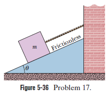 In Figure 5-36, let the mass of the block be and the angle be. Find (a) the tension in the cord and (b) the normal force acting on the block. (c) If the cord is cut, find the magnitude of the resulting acceleration of the block.