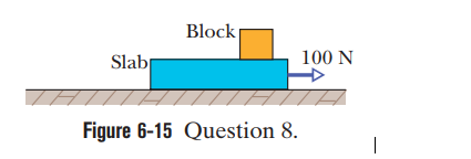 In Fig. 6-15, a horizontal force of 100Nis to be applied to a 10kg slab that is initially stationary on a frictionless floor, to accelerate the slab. A 10kg block lies on top of the slab; the coefficient of friction between the block and the slab is not known, and the block might slip. In fact, the contact between the block and the slab might even be frictionless. (a) Considering that possibility, what is the possible range of values for the magnitude of the slab’s accelerationlocalid="1657173176346" ? (Hint:You don’t need written calculations; just consider extreme values for m.) (b) What is the possible range for the magnitudelocalid="1657173167508" of the block’s acceleration?