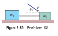 In Fig. 6-59, block 1 of massand block 2 of massare connected by a string of negligible mass. Block 2 is pushed by force of magnitude 20 Nand angle. The coefficient of kinetic friction between each block and the horizontal surface is 0.20. What is the tension in the string?