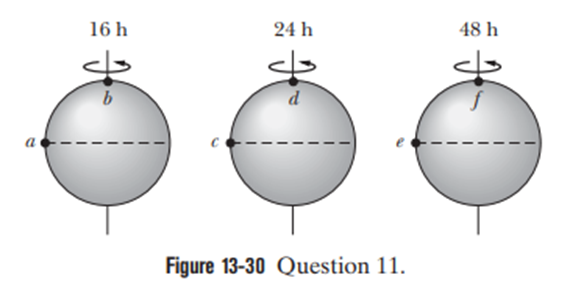Figure 13-30 shows three uniform spherical planets that are identical in size and mass. The periods of rotation Tfor the planets are given, and six lettered points are indicated鈥攖hree points are on the equators of the planets and three points are on the north poles. Rank the points according to the value of the free-fall acceleration gat them, greatest first.
