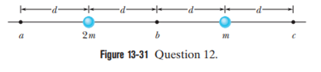 In Fig. 13-31, a particle of mass m(which is not shown) is to be moved from an infinite distance to one of the three possible locations a, b, and c. Two other particles, of masses mand 2m, are already fixed in place on the axis, as shown. Rank the three possible locations according to the work done by the net gravitational force on the moving particle due to the fixed particles, greatest first.