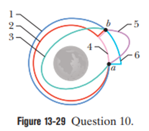 Figure 13-29 shows six paths by which a rocket orbiting a moon might move from point ato point b. Rank the paths according to (a) the corresponding change in the gravitational potential energy of the rocket鈥搈oon system and (b) the net work done on the rocket by the gravitational force from the moon, greatest first.