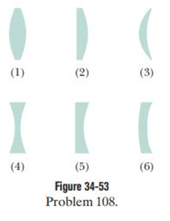 You grind the lenses shown in Fig. 34-53 from flat glass disks using a machine that can grind a radius of curvature of either or . In a lens where either radius is appropriate, you select the radius. Then you hold each lens in sunshine to form an image of the Sun. What are the (a) focal length fand (b) image type (real or virtual) for (bi-convex) lens 1, (c)f and (d) image type for (plane-convex) lens 2, (e) f and (f) image type for (meniscus convex) lens 3, (g) f and (h) image type for (bi-concave) lens 4, (i) fand (j) image type for (plane-concave) lens 5, and (k) f and (l) image type for (meniscus concave) lens 6?