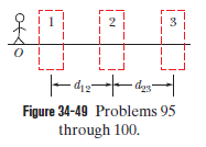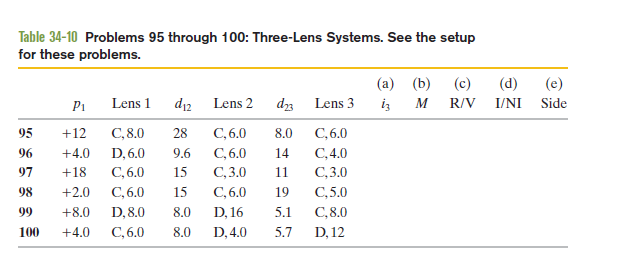 95 through 100. Three-lens systems. In Fig. 34-49, stick figure O (the object) stands on the common central axis of three thin, symmetric lenses, which are mounted in the boxed regions. Lens 1 is mounted within the boxed region closest to O, which is at object distance . Lens 2 is mounted within the middle boxed region, at distance from lens 1. Lens 3 is mounted in the farthest boxed region, at distance from lens 2. Each problem in Table 34-10 refers to a different combination of lenses and different values for distances, which are given in centimeters. The type of lens is indicated by C for converging and D for diverging; the number after C or D is the distance between a lens and either of the focal points (the proper sign of the focal distance is not indicated). Find (a) the image distance \for the (final) image produced by lens 3 (the final image produced by the system) and (b) the overall lateral magnification M for the system, including signs. Also, determine whether the final image is (c) real or virtual , (d) inverted from object O or non-inverted , and (e) on the same side of lens 3 as object O or on the opposite side.