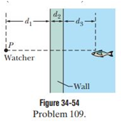 In Fig. 34-54, a fish watcher at point P watches a fish through a glass wall of a fish tank. The watcher is level with the fish; the index of refraction of the glass is , and that of the water is . The distances are . (a) To the fish, how far away does the watcher appear to be? (Hint: The watcher is the object. Light from that object passes through the walls outside surface, which acts as a refracting surface. Find the image produced by that surface. Then treat that image as an object whose light passes through the walls inside surface, which acts as another refracting surface.) (b) To the watcher, how far away does the fish appear to be?