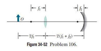 In Fig. 34-52, an object is placed in front of a converging lens at a distance equal to twice the focal length of the lens. On the other side of the lens is a concave mirror of focal lengthseparated from the lens by a distance . Light from the object passes rightward through the lens, reflects from the mirror, passes leftward through the lens, and forms a final image of the object. What are (a) the distance between the lens and that final image and (b) the overall lateral magnification M of the object? Is the image (c) real or virtual (if it is virtual, it requires someone looking through the lens toward the mirror), (d) to the left or right of the lens, and (e) inverted or non-inverted relative to the object?