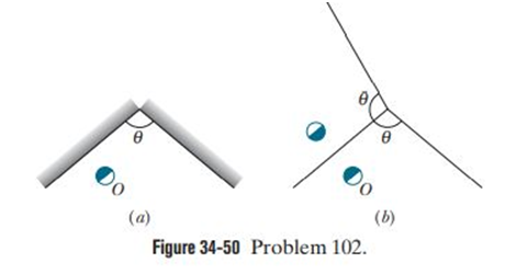 Figure 34-50a is an overhead view of two vertical plane mirrors with an object O placed between them. If you look into the mirrors, you see multiple images of O. You can find them by drawing the reflection in each mirror of the angular region between the mirrors, as is done in Fig. 34-50b for the left-hand mirror. Then draw the reflection of the reflection. Continue this on the left and on the right until the reflections meet or overlap at the rear of the mirrors. Then you can count the number of images of O. How many images of O would you see if is (a) , (b) , and (c) ? If , determine the (d) smallest and (e) largest number of images that can be seen, depending on your perspective and the location of O. (f) In each situation, draw the image locations and orientations as in Fig. 34-50b.