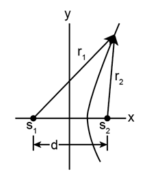 The two point sources in Fig 35-61 emit coherent waves. Show that all curves (such as the one shown), over which the phase difference for rays and in a constant, are hyperbolas. (Hint: A constant phase difference implies a constant difference in length between and ).