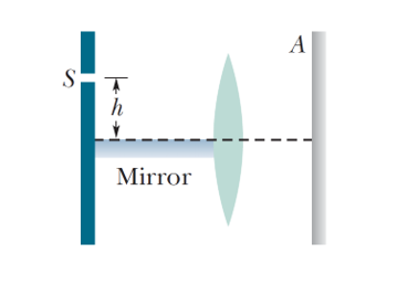In Fig, monochromatic light of wavelength diffracts through narrow slit S in an otherwise opaque screen. On the other side, a plane mirror is perpendicular to the screen and a distance h from the slit. A viewing screen A is a distance much greater than h. (Because it sits in a plane through the focal point of the lens, screen A is effectively very distant. The lens plays no other role in the experiment and can otherwise be neglected.) Light travels from the slit directly to A interferes with light from the slit that reflects from the mirror to A. The reflection causes a half-wavelength phase shift. (a) Is the fringe that corresponds to a zero path length difference bright or dark? Find expressions (like Eqs. 35-14 and 35-16) that locate (b) the bright fringes and (c) the dark fringes in the interference pattern. (Hint: Consider the image of S produced by the minor as seen from a point on the viewing screen, and then consider Young’s two-slit interference.)