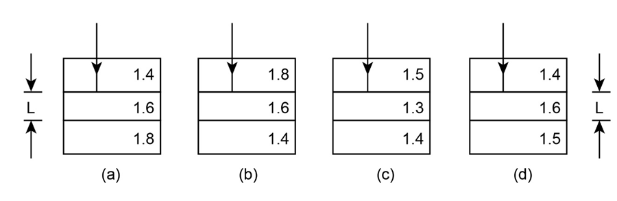 Suppose that the two waves in Fig. 35-4 have a wavelength in air. What multiple of gives their phase difference when they emerge if (a) , and ; (b) , , and ; and (c) , , and ? (d) Suppose that in each of these three situations, the waves arrive at a common point (with the same amplitude) after emerging. Rank the situations according to the brightness the waves produce at the common point.