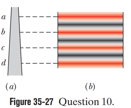 Figure 35-27a shows the cross-section of a vertical thin film whose width increases downward because gravitation causes slumping. Figure 35-27b is a face-on view of the film, showing four bright (red) interference fringes that result when the film is illuminated with a perpendicular beam of red light. Points in the cross section corresponding to the bright fringes are labeled. In terms of the wavelength of the light inside the film, what is the difference in film thickness between (a) points a and b and (b) points b and d?
