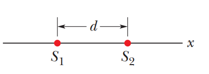 In Fig. 35-37, two radio frequency point sources and , separated by distance , are radiating in phase with . A detector moves in a large circular path around the two sources in a plane containing them. How many maxima does it detect?
