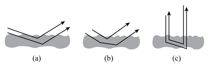 Figure 35-30 shows three situations in which two rays of sunlight penetrate slightly into and then scatter out of lunar soil. Assume that the rays are initially in phase. In which situation are the associated waves most likely to end up in phase? (Just as the Moon becomes full, its brightness suddenly peaks, becoming 25% greater than its brightness on the nights before and after, because at full Moon we intercept light waves that are scattered by lunar soil back toward the Sun and undergo constructive interference at our eyes. Before astronauts first landed on the Moon, NASA was concerned that backscatter of sunlight from the soil might blind the lunar astronauts if they did not have proper viewing shields on their helmets.)