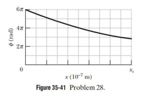 Figure 35-40 shows two isotropic point sources of light (and ) that emit in phase at wavelength 400 nm and at the same amplitude. A detection point P is shown on an x-axis that extends through source . The phase difference between the light arriving at point P from the two sources is to be measured as P is moved along the x axis from out to .The results out to are given in Fig. 35-41. On the way out to , what is the greatest value of x at which the light arriving at from is exactly out of phase with the light arriving at P from ?