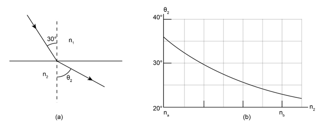 In Fig. 35-32a, a beam of light in material 1 is incident on a boundary at an angle of . The extent to which the light is bent due to refraction depends, in part, on the index of refraction of material 2. Figure 35-32b gives the angle of refraction versus for a range of possible values, from to . What is the speed of light in material 1?