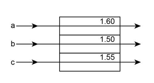 In Fig. 35-23, three pulses of light— , , and —of the same wavelength are sent through layers of plastic having the given indexes of refraction and along the paths indicated. Rank the pulses according to their travel time through the plastic layers, greatest first.