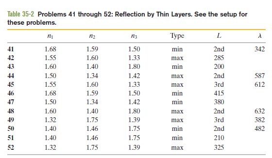 Reflection by thin layers. In Fig. 35-42, light is incident perpendicularly on a thin layer of material 2 that lies between (thicker) materials 1 and 3. (The rays are tilted only for clarity.) The waves of rays and interfere, and here we consider the type of interference to be either maximum (max) or minimum (min). For this situation, each problem in Table 35- 2 refers to the indexes of refraction ,and , the type of interference, the thin-layer thickness in nanometres, and the wavelength λ in nanometres of the light as measured in air. Where is missing, give the wavelength that is in the visible range. Where is missing, give the second least thickness or the third least thickness as indicated.