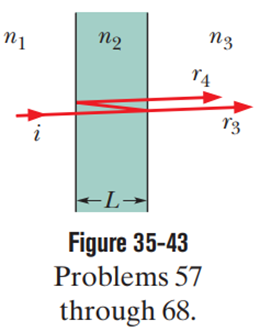 Transmission through thin layers. In Fig. 35-43, light is incident perpendicularly on a thin layer of material 2 that lies between (thicker) materials 1 and 3. (The rays are tilted only for clarity.) Part of the light ends up in material 3 as ray (the light does not reflect inside material 2) and (the light reflects twice inside material 2). The waves of and interfere,and here we consider the type of interference to be either maximum (max) or minimum (min). For this situation, each problem in Table 35-3 refers to the indexes of refraction and the type of interference, the thin-layer thickness in nanometers, and the wavelength in nanometers of the light as measured in air. Where is missing, give the wavelength that is in the visible range. Where is missing, give the second least thickness or the third least thickness as indicated.