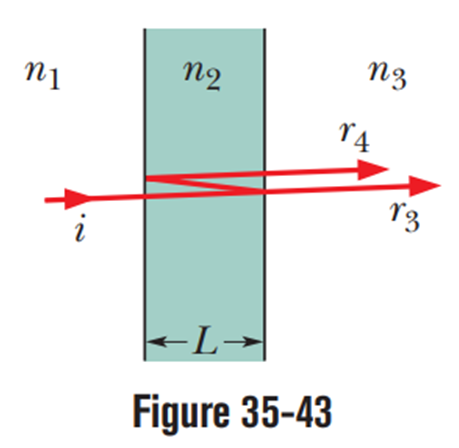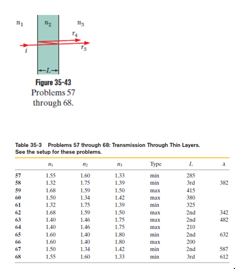Transmission through thin layers. In Fig. 35-43, light is incident perpendicularly on a thin layer of material 2 that lies between (thicker) materials 1 and 3. (The rays are tilted only for clarity.) Part of the light ends up in material 3 as ray (the light does not reflect inside material 2) and (the light reflects twice inside material 2). The waves of and interfere, and here we consider the type of interference to be either maximum (max) or minimum (min). For this situation, each problem in Table 35-3 refers to the indexes of refraction , the type.
