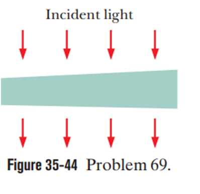 In Fig. 35-44, a broad beam of light of wavelength 630 nm is incident at 90° on a thin, wedge-shaped film with index of refraction 1.50. Transmission gives 10 bright and 9 dark fringes along the film’s length. What is the left-to-right change in film thickness?