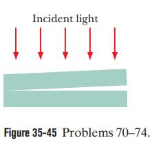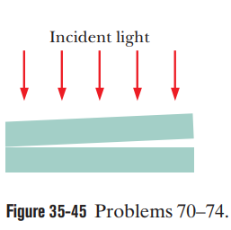 In Fig. 35-45, a broad beam of monochromatic light is directed perpendicularly through two glass plates that are held together at one end to create a wedge of air between them. An observer intercepting light reflected from the wedge of air, which acts as a thin film, sees 4001 dark fringes along the length of the wedge. When the air between the plates is evacuated, only 4000 dark fringes are seen. Calculate to six significant figures the index of refraction of air from these data.