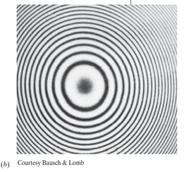 Figure 35-46a shows a lens with radius of curvature lying on a flat glass plate and illuminated from above by light with wavelength l. Figure 35-46b (a photograph taken from above the lens) shows that circular interference fringes (known as Newton’s rings) appear, associated with the variable thickness d of the air film between the lens and the plate. Find the radii r of the interference maxima assuming.