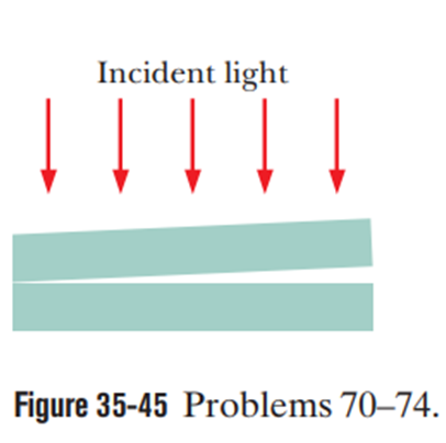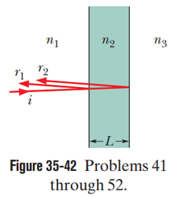 Reflection by thin layers. In Fig. 35-42, light is incident perpendicularly on a thin layer of material 2 that lies between (thicker) materials 1 and 3. (The rays are tilted only for clarity.) The waves of rays andinterfere, and here we consider the type of interference to be either maximum (max) or minimum (min). For this situation, each problem in Table 35- 2 refers to the indexes of refraction ,, and, the type of interference, the thin-layer thicknessin nanometres, and the wavelengthin nanometres of the light as measured in air. Whereis missing, give the wavelength that is in the visible range. Whereis missing, give the second least thickness or the third least thickness as indicated.