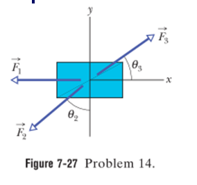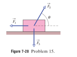 Figure 7-28shows three forces applied to a trunk that moves leftward by 3.00 m over a frictionless floor. The force magnitudes are , , and , and the indicated angle is . During the displacement, (a) what is the net work done on the trunk by the three forces and (b) does the kinetic energy of the trunk increase or decrease?