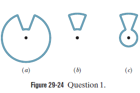 Figure 29-24 shows three circuits, each consisting of two radial lengths and two concentric circular arcs, one of radius rand the other of radius R>r. The circuits have the same current through them and the same angle between the two radial lengths. Rank the circuits according to the magnitude of the net magnetic field at the center, greatest first