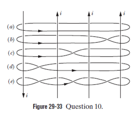 Shows four identical currents iand five Amperian paths (athrough e) encircling them. Rank the paths according to the value of taken in the directions shown, most positive first.