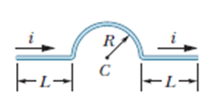 In Fig. 29-4, a wire forms a semicircle of radius and two (radial) straight segments each of length . The wire carries current . What are the(a) magnitude and(b) direction (into or out of the page) of the net magnetic field at the semicircle’s center of curvature C?