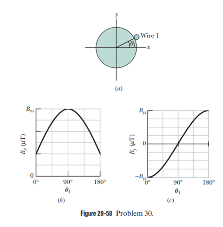 Figure 29-58ashows, in cross section, the cylinder and wire 1 but not wire 2. With wire 2 fixed in place, wire 1 is moved around the cylinder, from angle localid="1663154367897" to angle localid="1663154390159" , through the first and second quadrants of the xycoordinate system. The net magnetic field at the center of the cylinder is measured as a function of . Figure 29-58b gives the x component of that field as a function of (the vertical scale is set by ), and Fig. 29-58c gives the y component(the vertical scale is set by ). (a) At what angle is wire 2 located? What are the (b) size and (c) direction (into or out of the page) of the current in wire 1 and the (d) size and (e) direction of the current in wire 2?