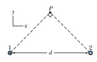 Figure 29-82 shows, in cross section, two long parallel wires spaced by distance d=10.0cm; each carries 100A, out of the page in wire 1. Point Pis on a perpendicular bisector of the line connecting the wires. In unit-vector notation, what is the net magnetic field at Pif the current in wire 2 is (a) out of the page and (b) into the page?