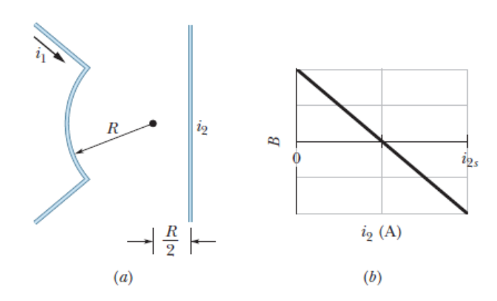 Question: Figure 29-56ashows two wires, each carrying a current .Wire 1 consists of a circular arc of radius Rand two radial lengths; it carries current in the direction indicated. Wire 2 is long and straight; it carries a current i2 that can be varied; and it is at distancefrom the center of the arc. The net magnetic field due to the two currents is measured at the center of curvature of the arc. Figure 29-56bis a plot of the component of in the direction perpendicular to the figure as a function of current i2. The horizontal scale is set by. What is the angle subtended by the arc?