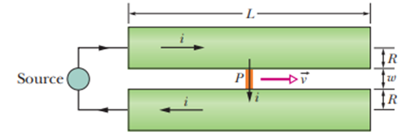 Figure 29-89 is an idealized schematic drawing of a rail gun. Projectile Psits between two wide rails of circular cross section; a source of current sends current through the rails and through the(conducting) projectile (a fuse is not used). (a) Let wbe the distance between the rails, Rthe radius of each rail, and i the current. Show that the force on the projectile is directed to the right along the rails and is given approximately by