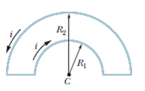 In Fig. 29-40, two semicircular arcs have radii and carry current and have the same center of curvature C. What are the (a) magnitude and (b) direction (into or out of the page) of the net magnetic field at C?