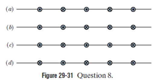 Question: Figure 29-31 shows four arrangements in which long, parallel, equally spaced wires carry equal currents directly into or out of the page. Rank the arrangements according to the magnitude of the net force on the central wire due to the currents in the other wires, greatest first.