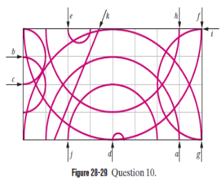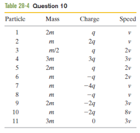Figure 28-29 shows 11 paths through a region of uniform magnetic field. One path is a straight line; the rest are half-circles. Table 28-4 gives the masses, charges, and speeds of 11 particles that take these paths through the field in the directions shown. Which path in the figure corresponds to which particle in the table? (The direction of the magnetic field can be determined by means of one of the paths, which is unique.)