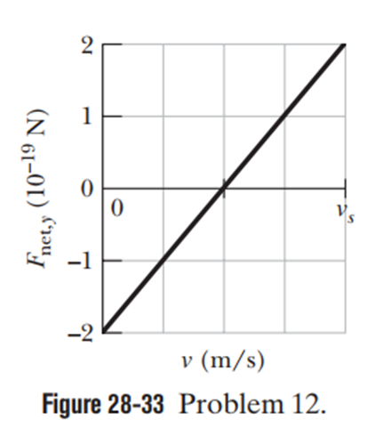 At time t1, an electron is sent along the positive direction of an x-axis, through both an electric fieldand a magnetic field, withdirected parallel to the y-axis. Figure 28-33 gives the ycomponent Fnet, yof the net force on the electron due to the two fields, as a function of theelectron’s speed vat time t1.The scale of the velocity axis is set by100.0 m/s. The xand zcomponents of the net force are zero at t1. Assuming, find