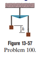 In Fig. 13-57, identical blocks with identical masses m=2.00 kghang from strings of different lengths on a balance at Earth’s surface.The strings have negligible mass and differ in length by h=5.00 cm. Assume Earth is spherical with a uniform density r=5.5. g/cm3. What is the difference in the weight of the blocks due to one being closer to Earth than the other?