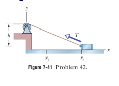 Figure 7-41shows a cord attached to a cart that can slide along a frictionless horizontal rail aligned along an x axis. The left end of the cord is pulled over a pulley, of negligible mass and friction and at cord height, so the cart slides from. During the move, the tension in the cord is a constant. What is the change in the kinetic energy of the cart during the move?