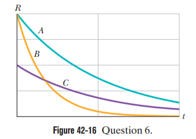 Figure 42-16 gives the activities of three radioactive samples versus time. Rank the samples according to their (a) half-life and (b) disintegration constant, greatest first. (Hint:For (a), use a straightedge on the graph.)