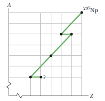 Figure 42-20 shows part of the decay scheme ofon a plot of mass number Aversus proton number Z; five lines that represent either alpha decay or beta-minus decay connect dots that represent isotopes. What is the isotope at the end of the five decays (as marked with a question mark in Fig. 42-20)?