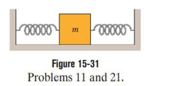 In Figure, two identical springs of spring constantare attached to a block of mass. What is the frequency of oscillation on the frictionless floor?